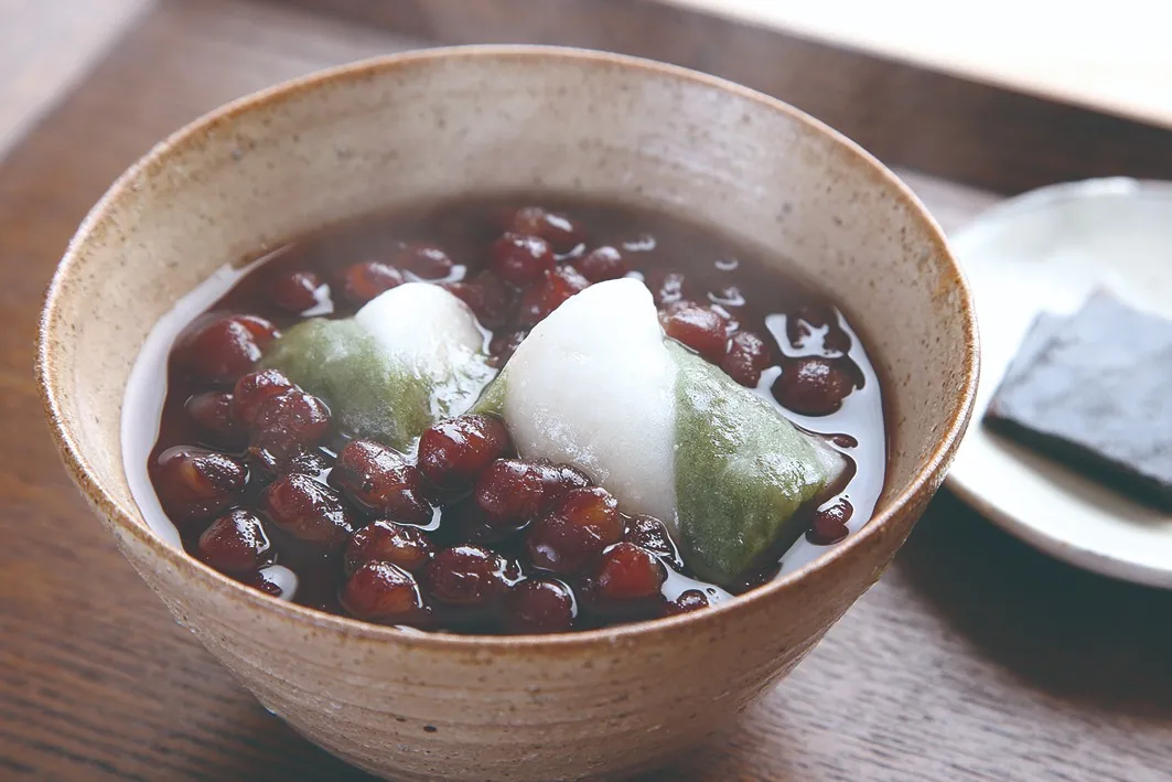 大粒の小豆を独自の製法でふっくらと炊き上げ、しっかりと粒を残すように仕上げたぜんざいの上に、石餅をのせました。