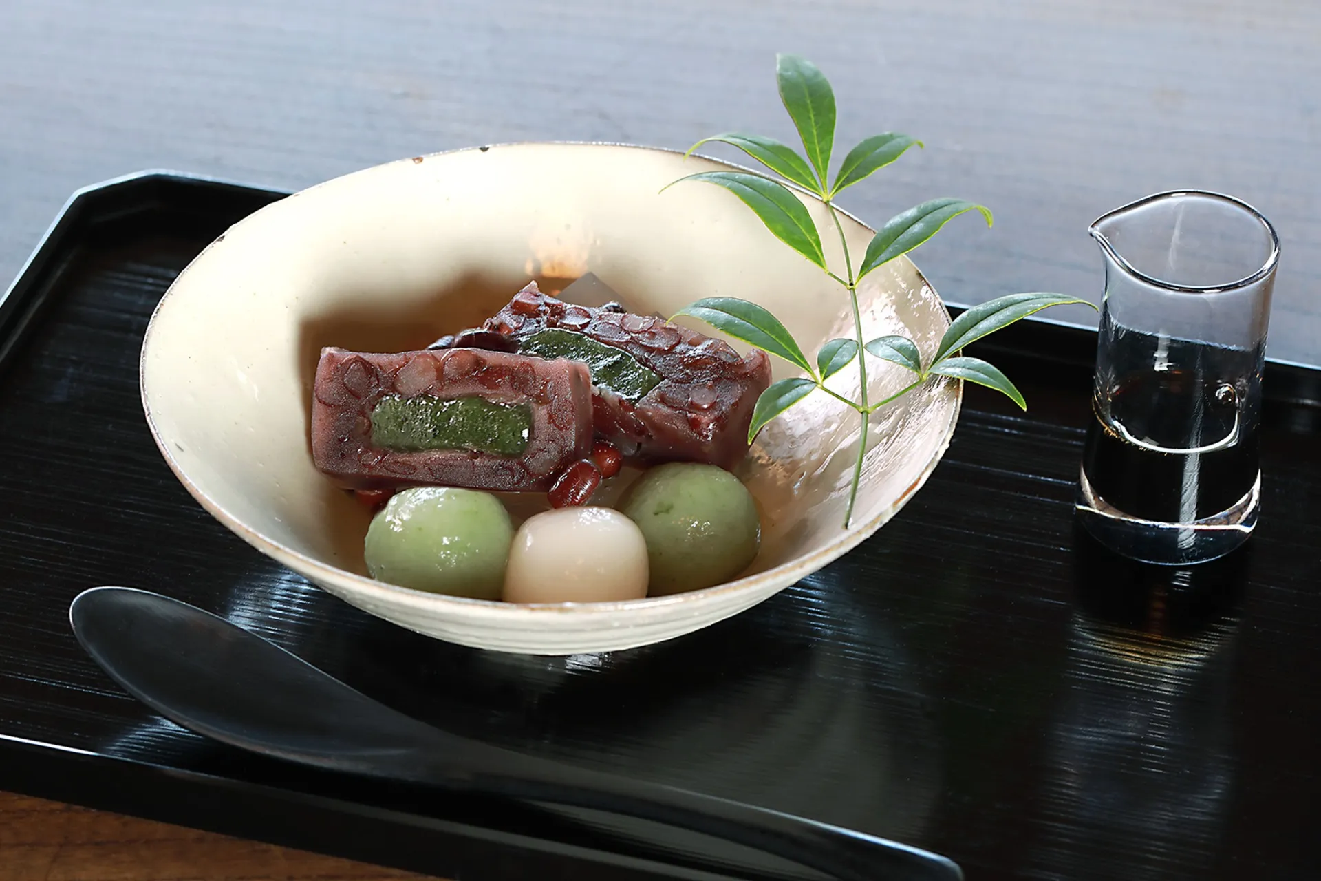 叶 匠壽庵の代表銘菓「あも」と長野県・小笠原商店さまの天然糸寒天 を使用した寒天、白玉を合わせあんみつ風に仕立てた「あもみつ」。 丹波大納言小豆の風味と天然糸寒天の歯切れの良い食感を、波照間産 黒糖の濃厚な黒蜜でお楽しみください。
