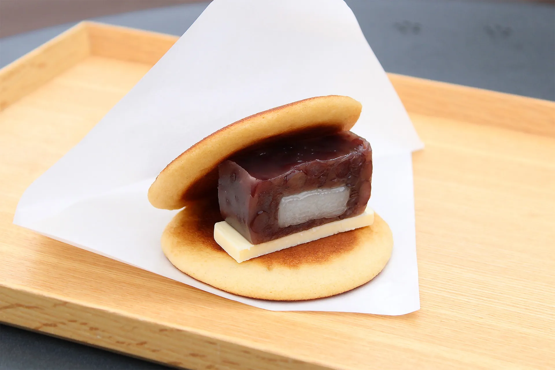 しっとりとしたどらやきに、代表銘菓「あも」とバターを挟んだ一品。ほろほろとほどける小豆に、バターの塩味とコクがとけ込む一体感をお楽しみいただけます。