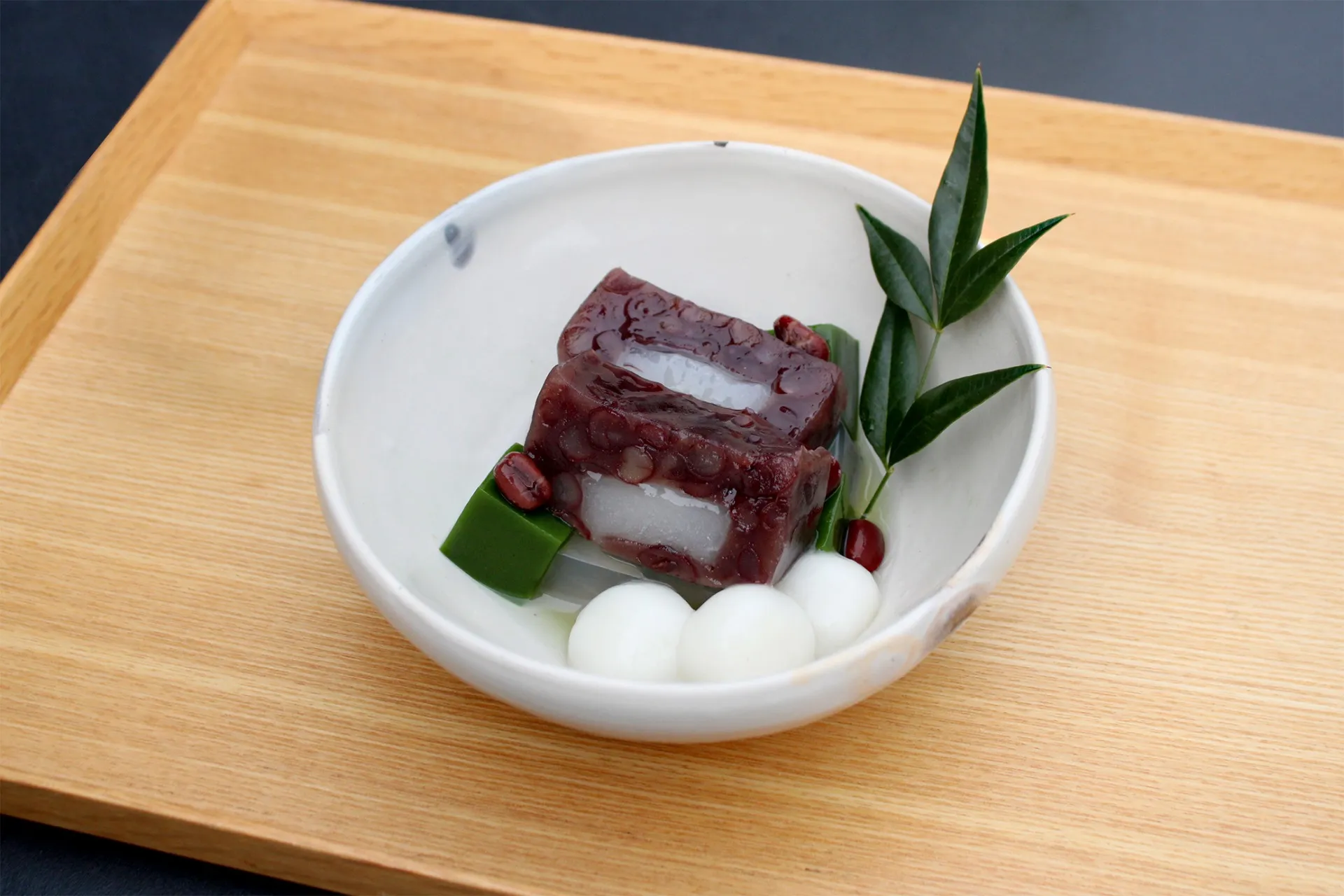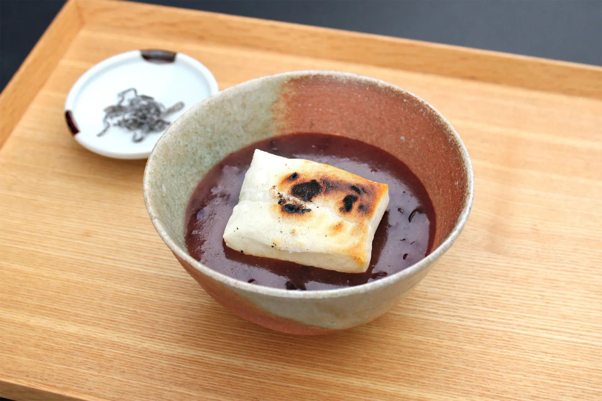 「あも」を溶かした善哉に香ばしく焼き上げた餅を添えて。お口直しの塩昆布もご一緒にどうぞ。