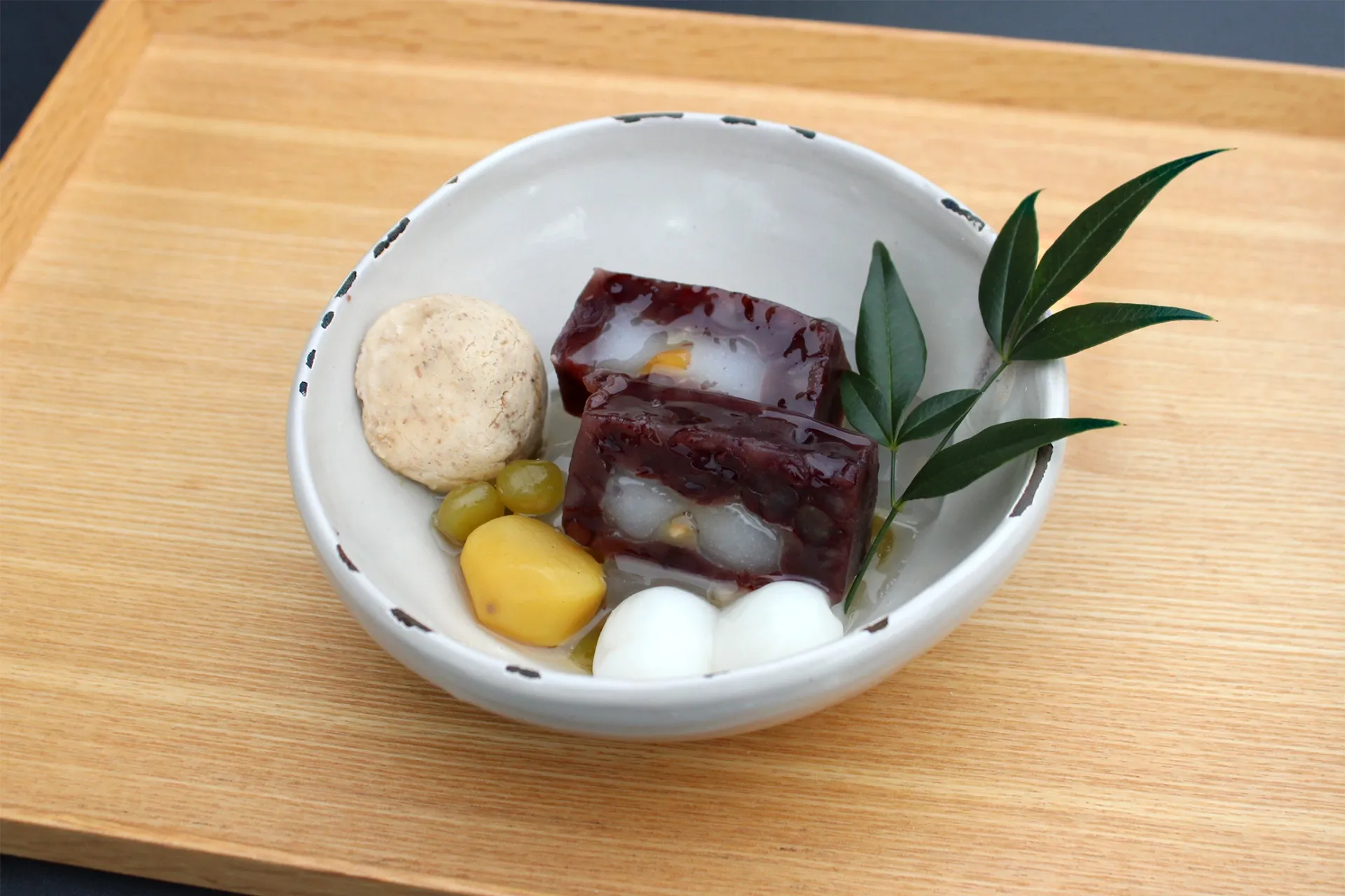 あもと長野県・小笠原商店さまの天然糸寒天 を使用した寒天、白玉を合わせあんみつ風に仕立てた「あもみつ」。 丹波大納言小豆の風味と天然糸寒天の歯切れの良い食感を、波照間産黒糖の濃厚な黒蜜でお楽しみください。