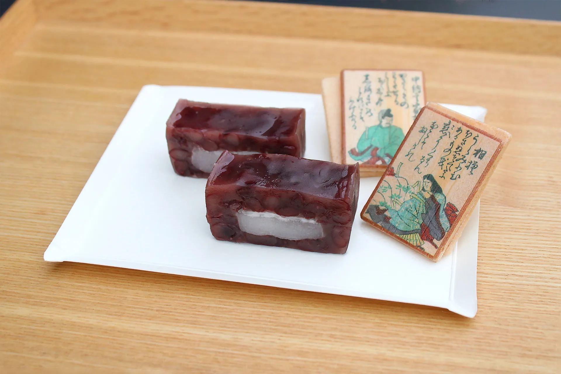 百人一首の絵柄のさくさく最中種で「あも」を挟んでお愉しみください。あもは〈あも・あも(こしあん)・季節あも〉から2種類お選びください。