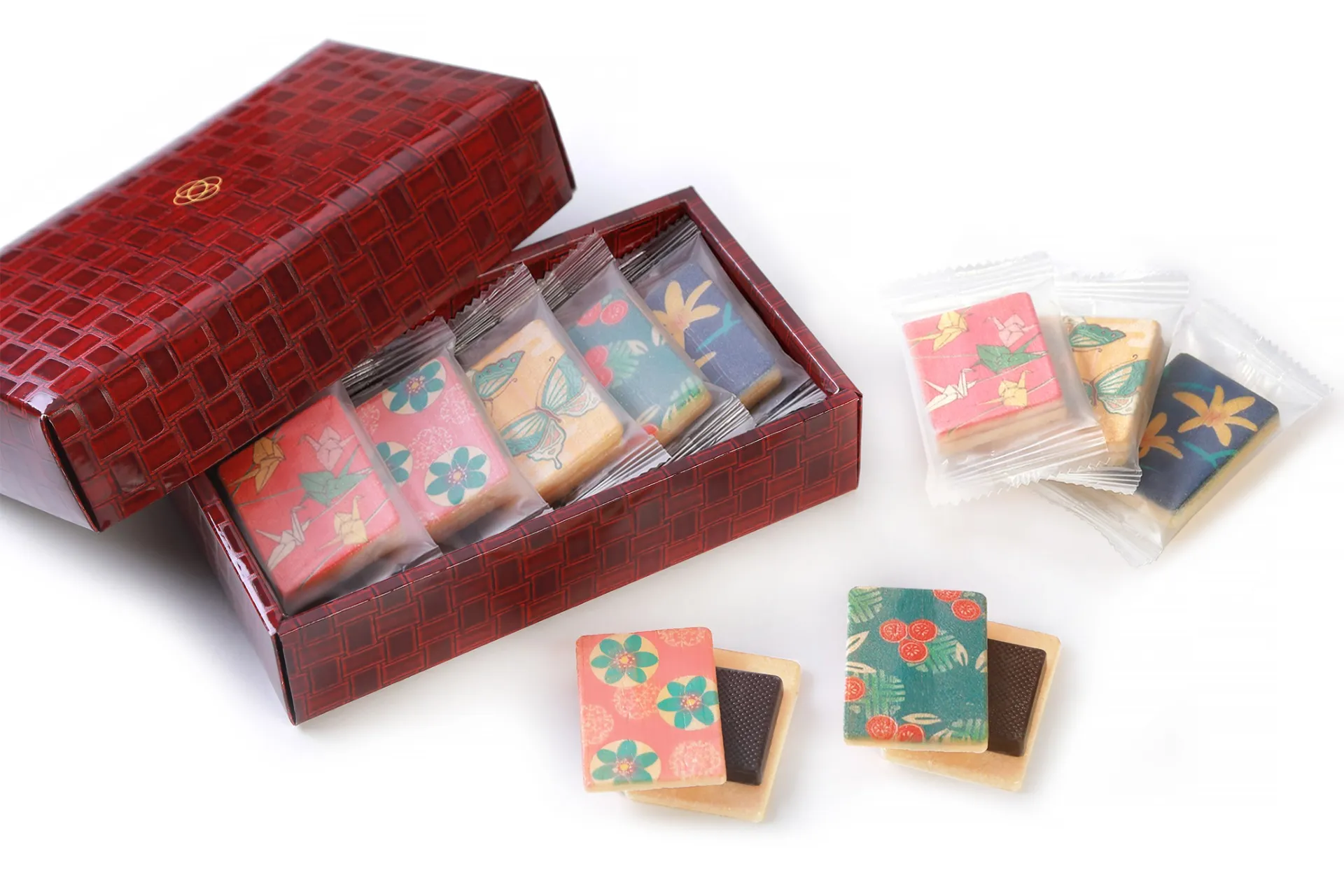 香ばしい最中種に、くちどけのよいチョコレートを挟んで味わうチョコ最中。5種の最中種に草花や生き物を色とりどりにちりばめました。