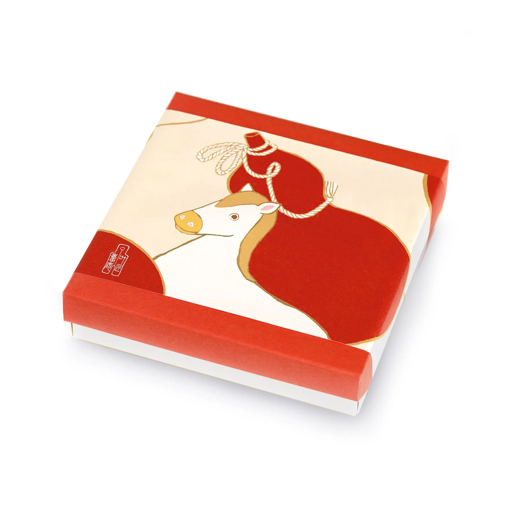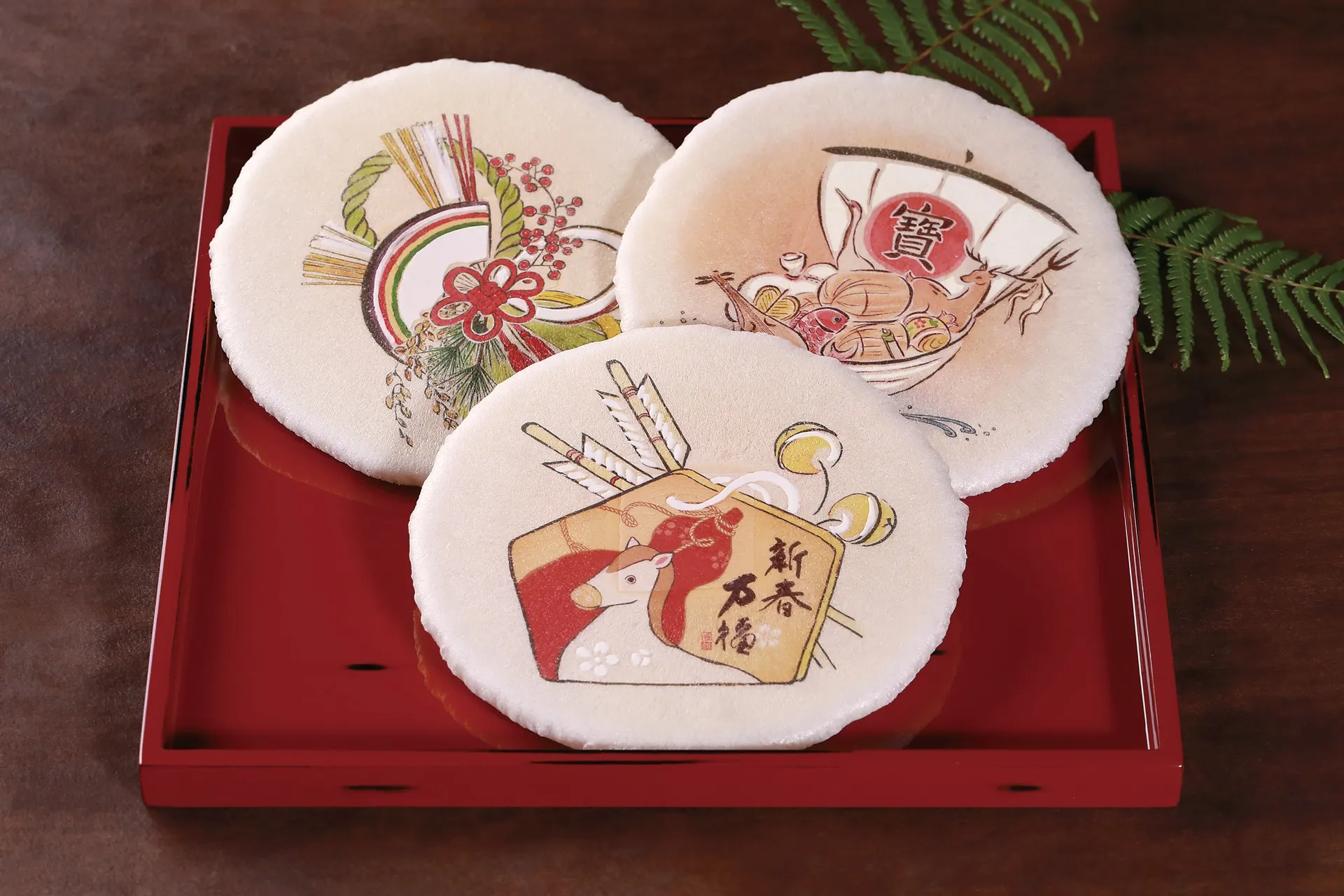 おめでたい絵柄が描かれた、ほんのり甘いふ焼きせんべいです。
