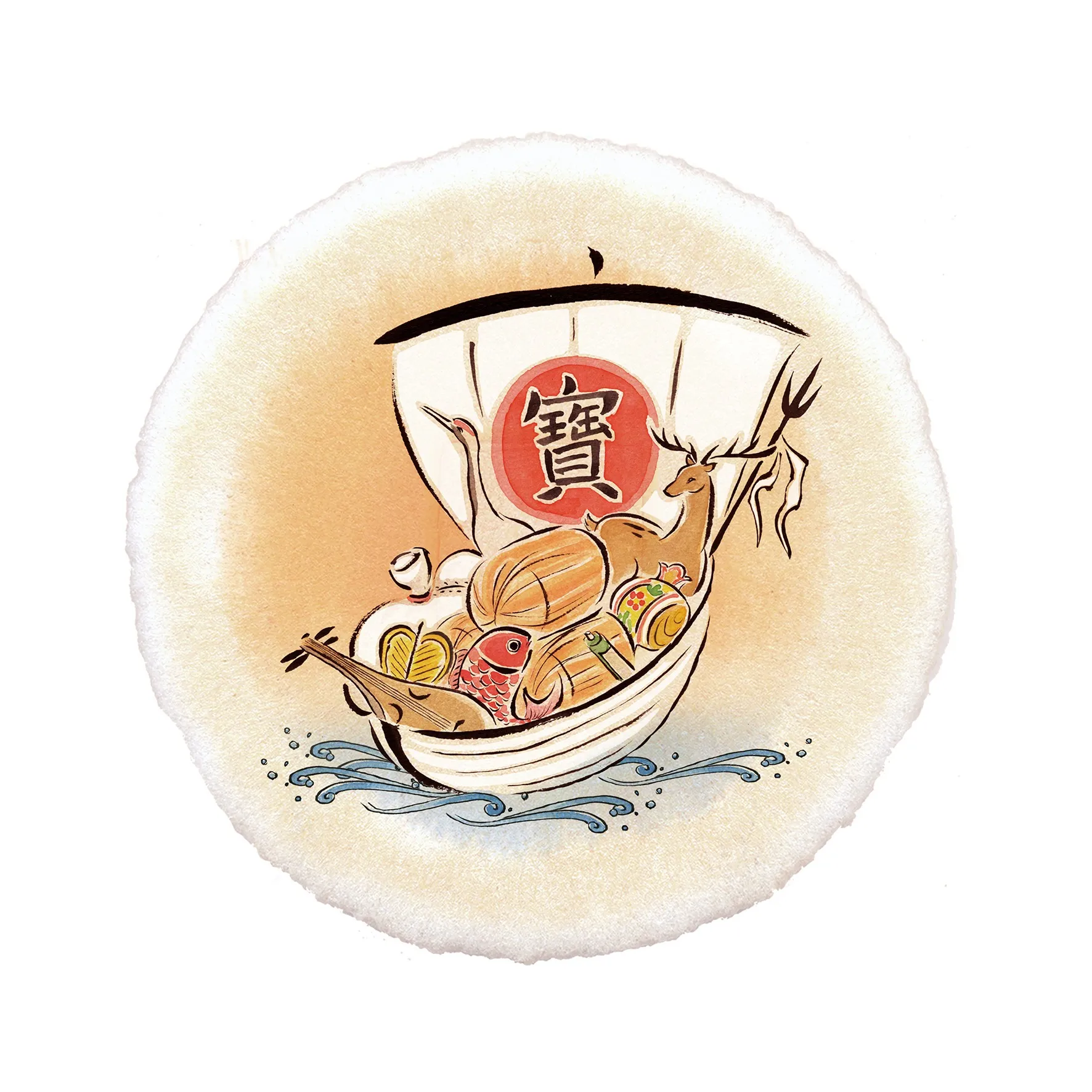 宝船は七福神や宝物が積み込んであり、おめでたい船とされています。宝船に回文歌が書かれた絵を正月の2日に枕の下に入れて寝ると、良い初夢を見ることができると言われています。午年も良い一年となりますように。 回文歌:「なかきよの とおのねふりの みなめさめ なみのりふねの おとのよきかな」 (永き世の 遠の眠りの みな目ざめ 波乗り船の 音のよきかな)