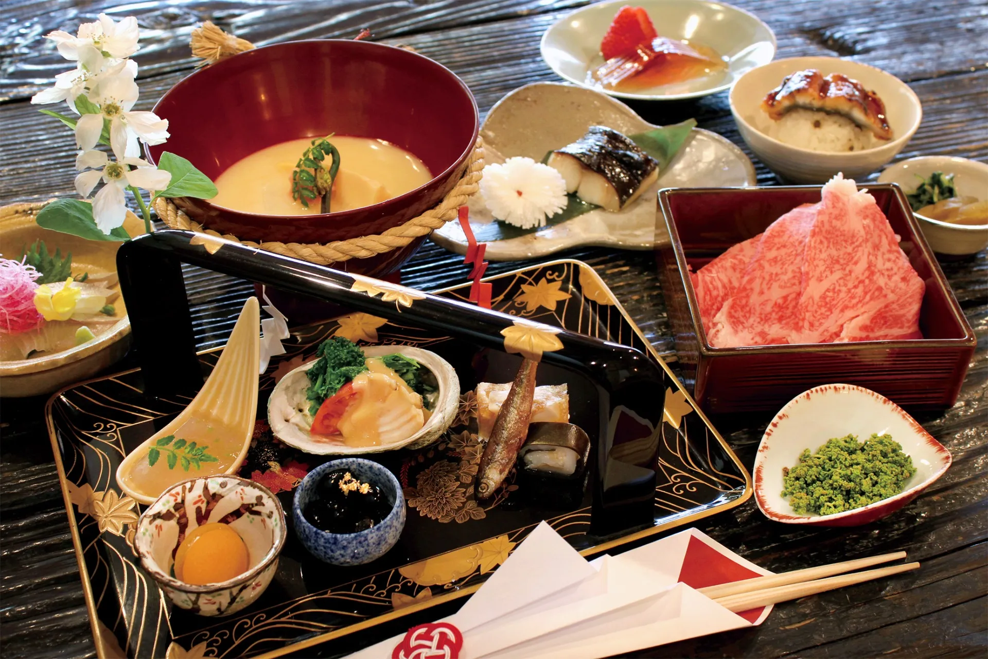 最高級の近江牛ロースと京都大原の柔らかい筍を秘伝のたれで炙り焼きにし、郷の花山椒を添えた期間限定のプレミアムなひつまぶしです。