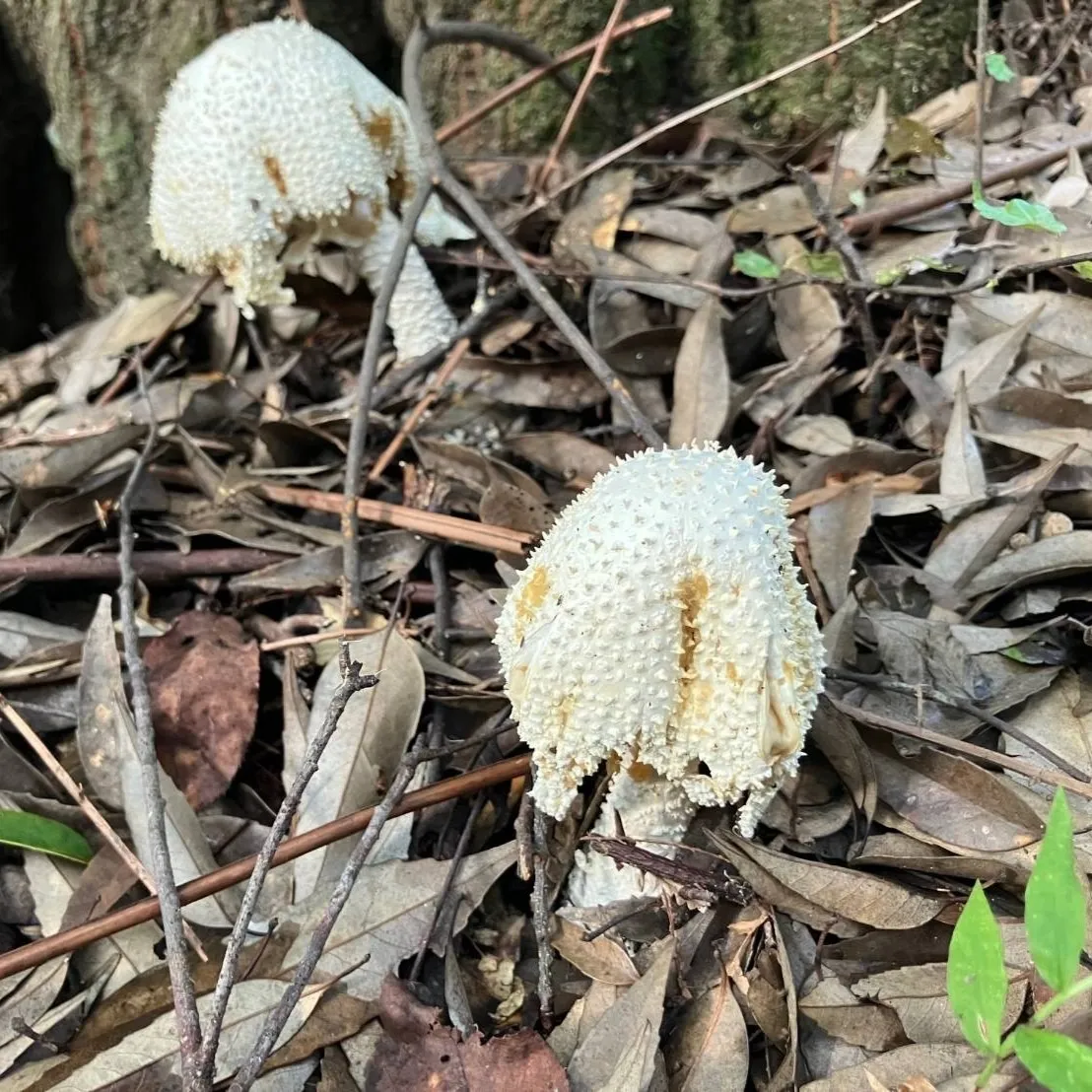 きのこ変化球 2025/10/10 たぶん同じ種類のきのこなのです。調べてみるとシロオニタケ?毒があるそうです。毒がなくても食べる気にはなりませんね。ちょっと暗い山の中のあっちこちに出ていました。(たんざわ) 2025年10月 花のおはなし
