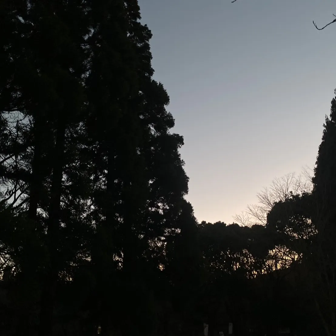 木々のシルエットに、陽が沈みゆく空のグラデーション。