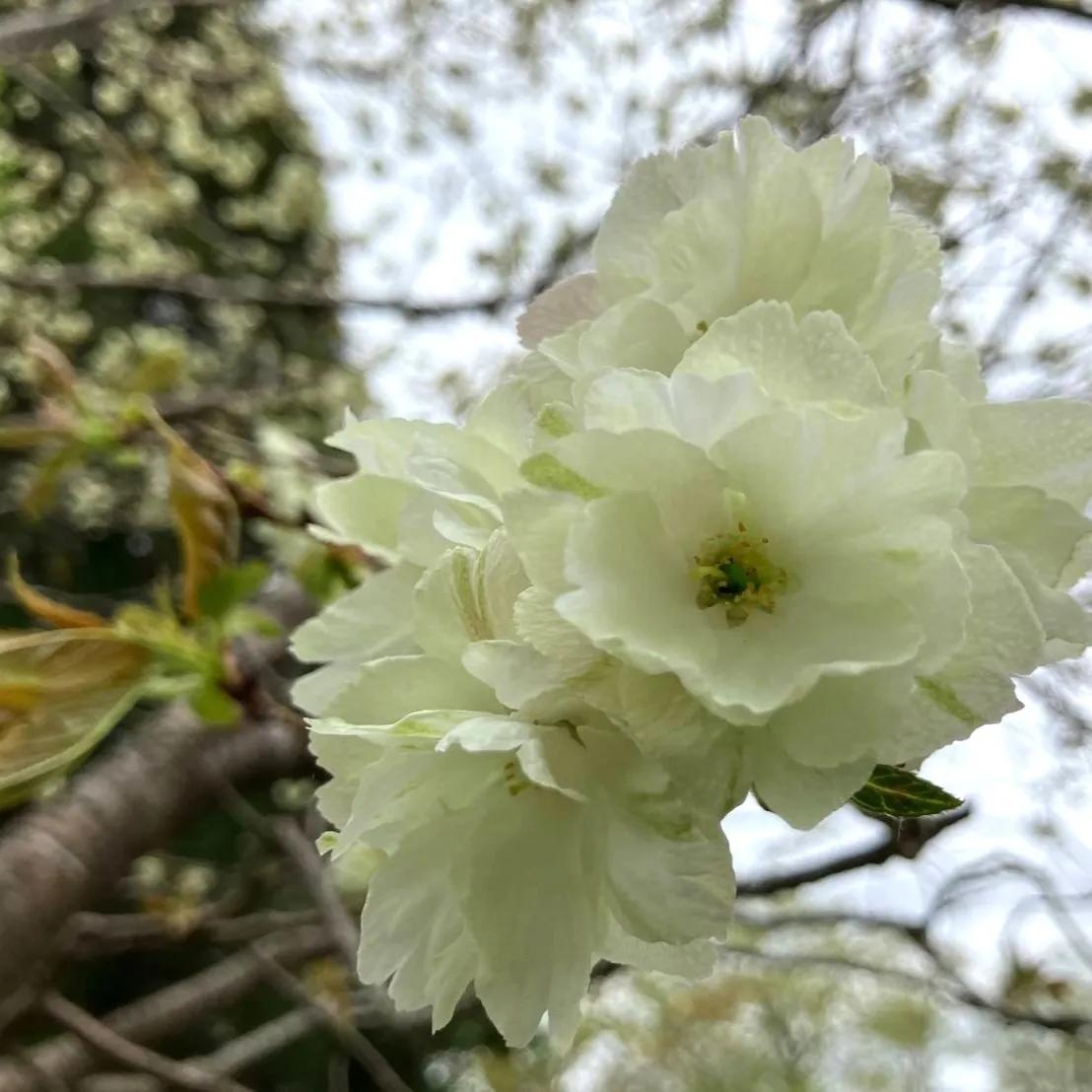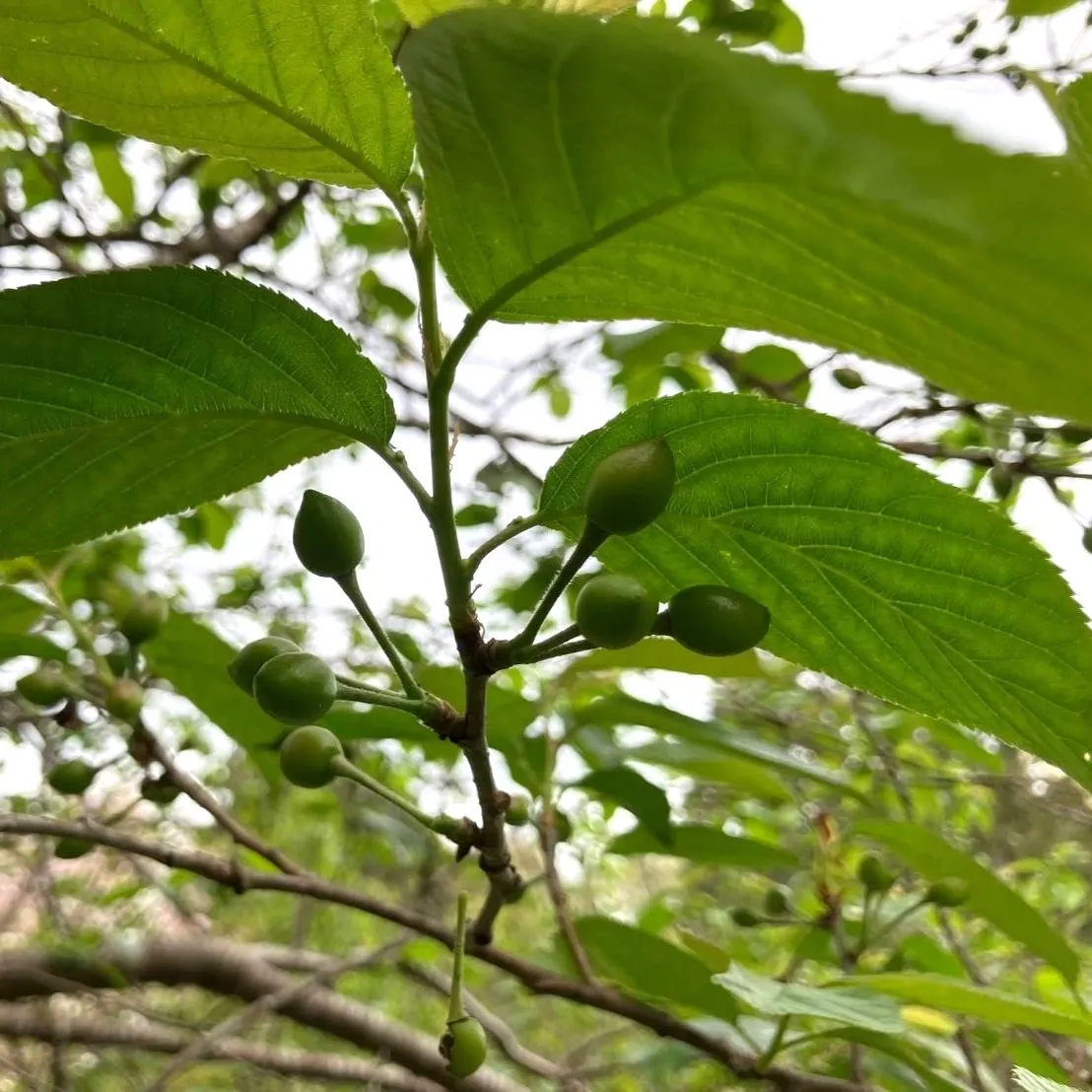 一重の桜が八重に変わっています。どうりで新入社員さんたちの顔にも馴染み感が出てくるわけです。みどりの御衣黄桜/ギョイコウ、それより白っぽいのは鬱金/ウコン、桃色はおそらく関山/カンザンです。一足先に咲いた暖地桜桃/ダンチオウトウはもうこんなにも果実を膨らませています。(たんざわ)