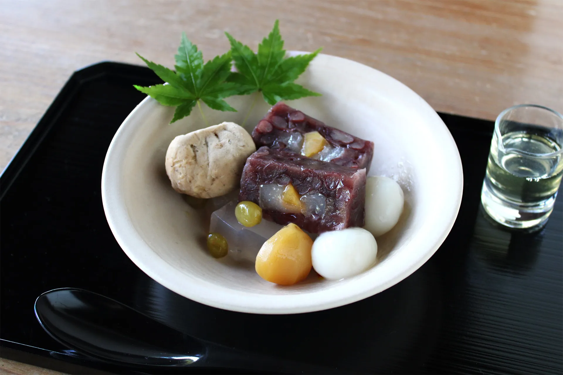 季節限定の「あも(栗)」と丁寧にこしたなめらかな栗と手掘りした栗 を合わせた「くりきんとん」、栗の甘露煮、寒天、白玉をあんみつ風に仕 立てました。栗蜜をかけて秋の味覚をお楽しみください。