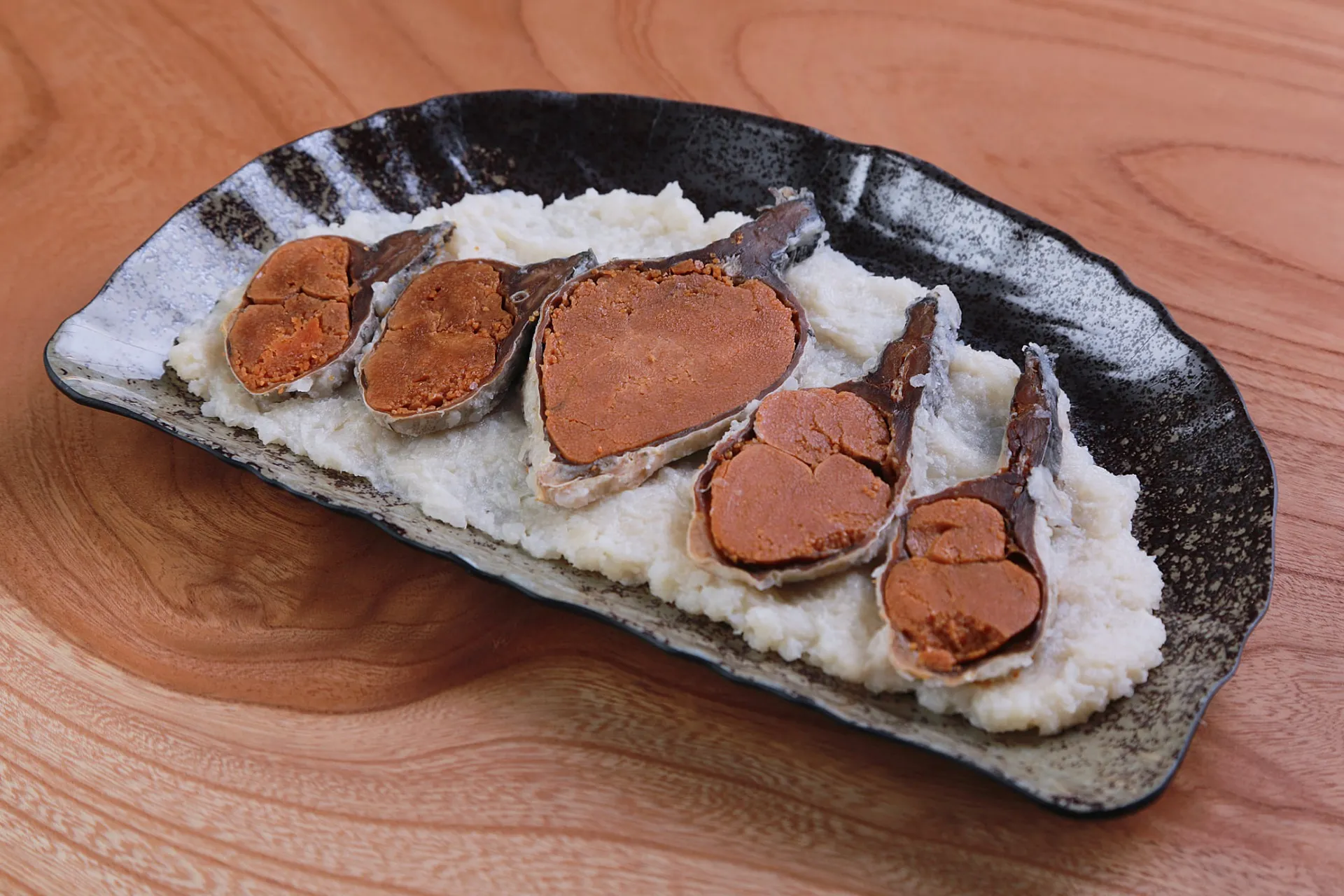 近江浅井大納言小豆のつぶ餡を滋賀羽二重もちで包み、塩味のある小豆納豆をのせています。