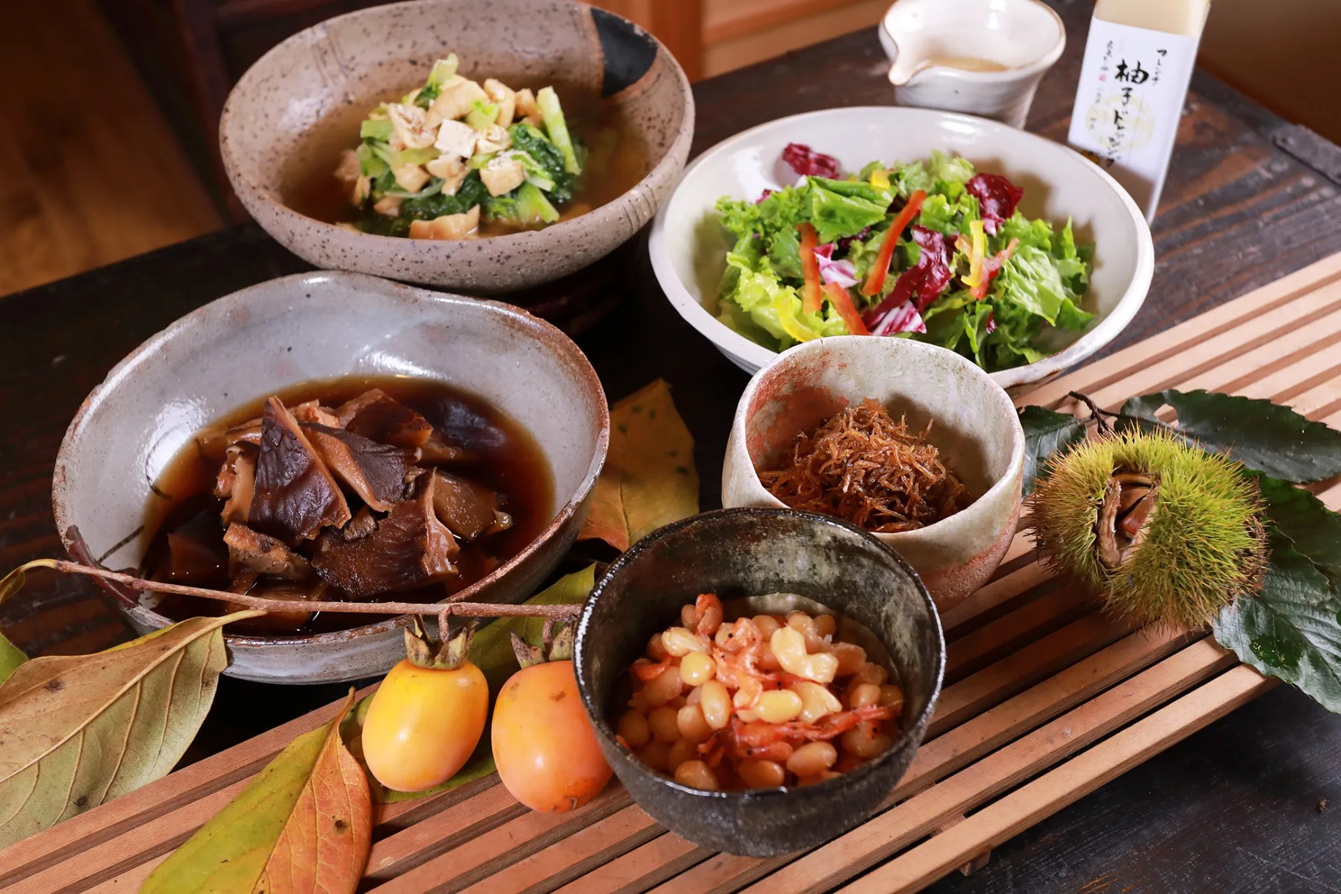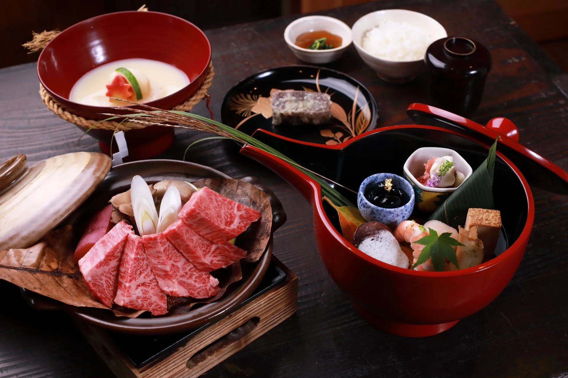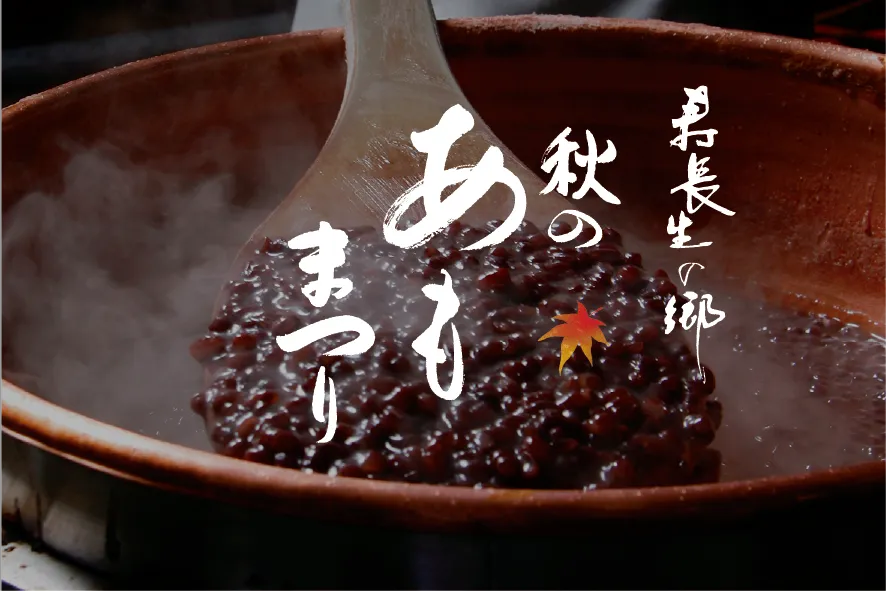 寿長生の郷創業時からの名物、福沸かしや長寿を願う鮑や黒豆、雪をまとった栗などを片口に盛り込んだ八寸、秋の野菜と近江牛を朴葉の香りと味噌で楽しむ近江牛の朴葉味噌焼きなどを召し上がっていただく40周年、あも祭り限定の御膳です。