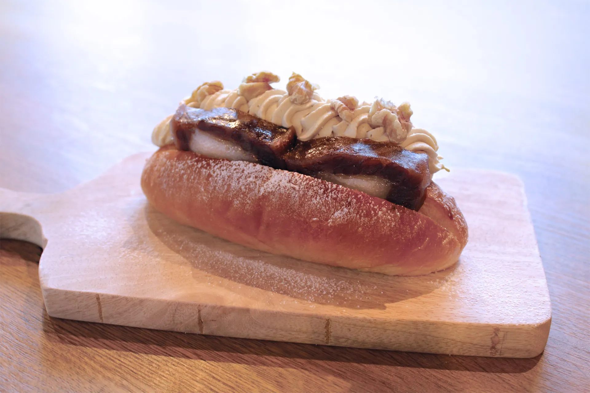 野坐オリジナルのコッペパンに、波照間産黒糖粉末で作った黒糖ホイップ、代表銘菓「あも」を贅沢にはさみこみました。秋にピッタリ!優しい甘さのほっこりコッペ誕生です!