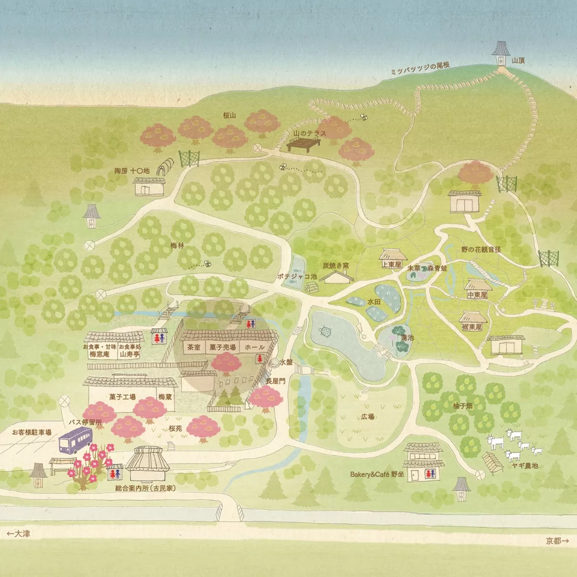 寿長生の郷、長屋門をくぐった先にある菓子売場。代表銘菓「あも」などの銘菓を販売しております。叶 匠壽庵の菓子は寿長生の郷内の工場でつくられ全国へ運ばれます。