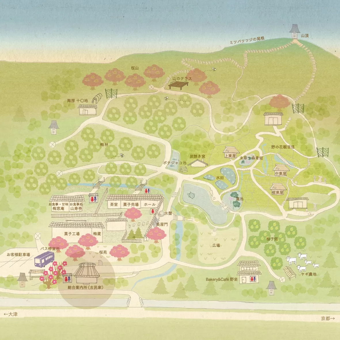 代表銘菓「あも」などの銘菓を販売しております。叶 匠壽庵の菓子は寿長生の郷内の工場でつくられ全国へ運ばれます。